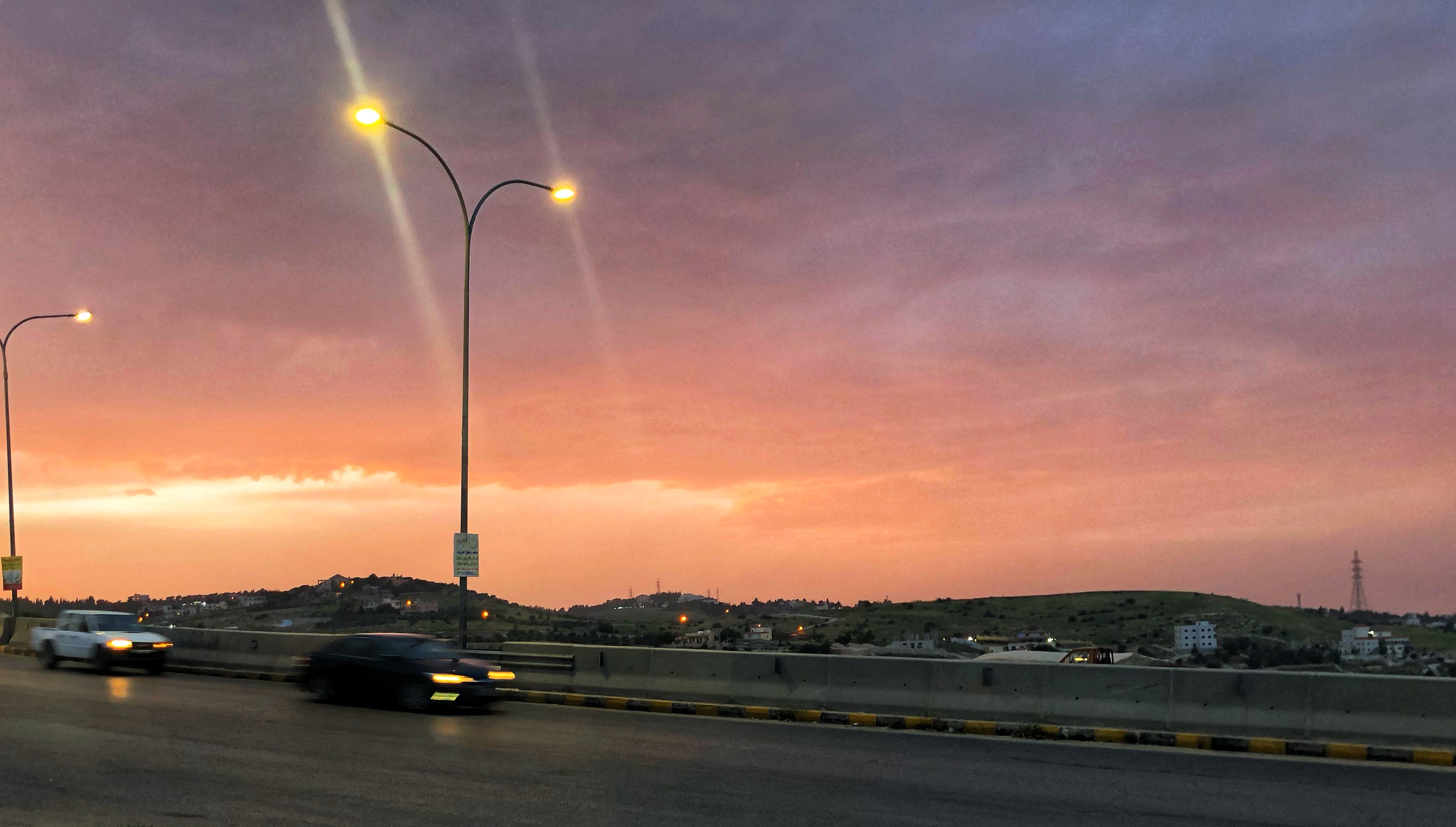 Dawn is at the horizon and I take a break shortly before Amman. The clock hits 07:26 p.m. The sun has gone down. I instantly hear prayers from the mosque towers and boys run out on the streets, selling water to cars passing by. I ride down to Amman, dawn in my rear view mirror and evening prayers in my ears.