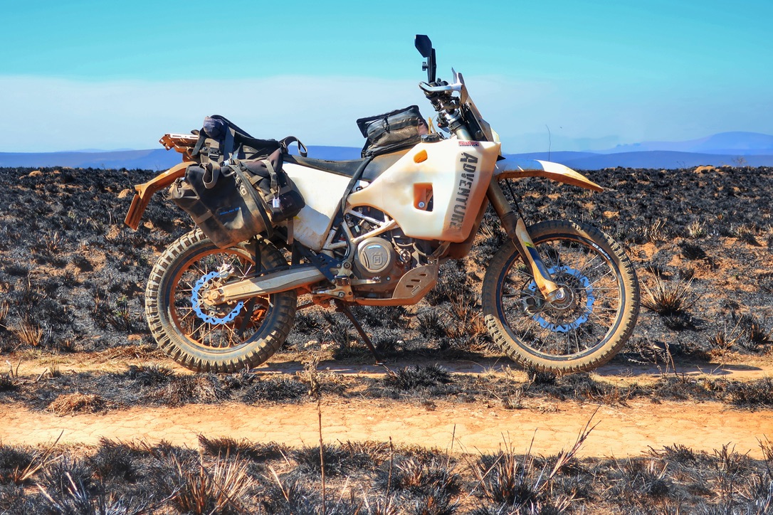 It is only 60km from the gate to the campsite. Tired and not focused enough anymore, the Husky & I slip on a sloping sand stretch just 30km before the campsite. While skidding over the track, my foot gets caught under the luggage & I twist my ankle. The Husky takes a beating. Her handle bar is crooked & the foot-brake bent severely. I ride the final 30km across bumpy tracks to the campsite. After pitching the tent we target a lodge close by. I treat the Husky & organize some ice to cool down my now swollen foot. Some cream, a magic pill & I sleep 12h.